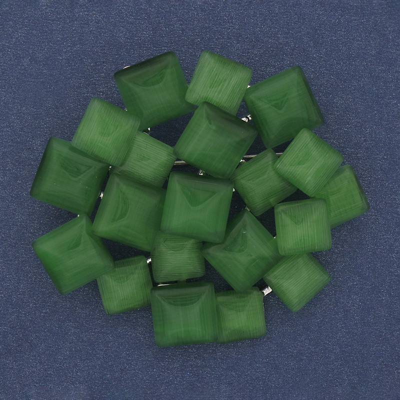 Зелений камінь котяче око відомий своєю глибокою грою світла — він нагадує блиск дорогоцінного шовку, що переливається різними відтінками. Такий ефект додає виробу живості та загадковості. Цей колір асоціюється зі спокоєм, природою та гармонією, тому прикраса чудово підходить для тих, хто цінує природну красу в сучасному виконанні.