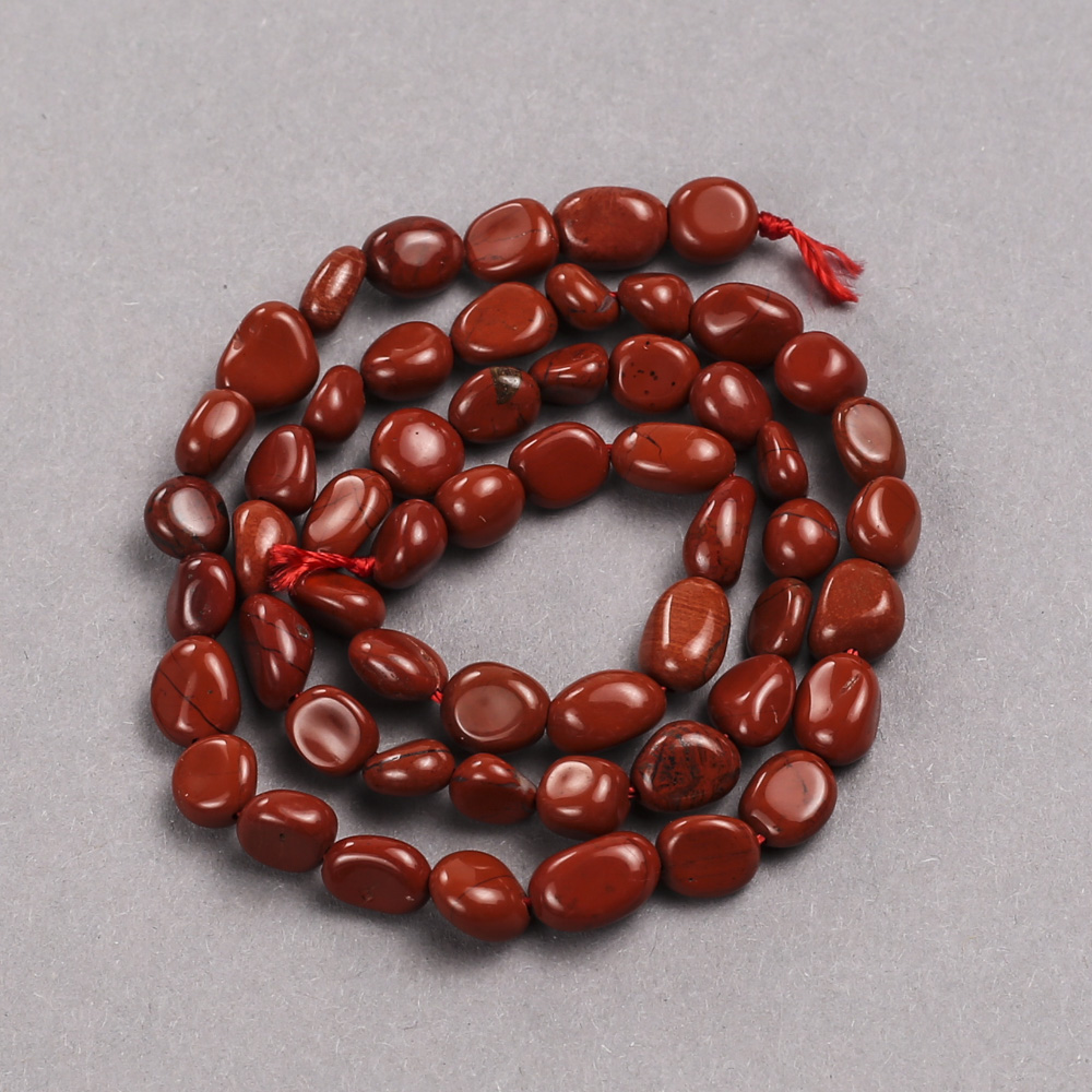 Галтовані намистини діаметром приблизно 8х6 мм мають приємну, гладеньку поверхню, яка м’яко відбиває світло, створюючи природне сяйво. Відтінки червоної яшми варіюються від насиченого теракотового до глибокого винного, що додає композиціям тепла та виразності. Довжина нитки близько 39 см дозволяє легко комбінувати ці камені з іншими матеріалами — металевою фурнітурою, деревом, склом чи перлами.