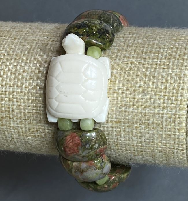 Акцентом прикраси є декоративна фігурка черепахи з акрилу — символ мудрості, стабільності та довголіття. Вона додає браслету індивідуальності, роблячи його не просто аксесуаром, а маленькою історією, яку хочеться носити щодня. Стрейч-основа забезпечує комфортне прилягання до зап’ястя, дозволяючи легко надягати браслет і поєднувати його з іншими прикрасами.