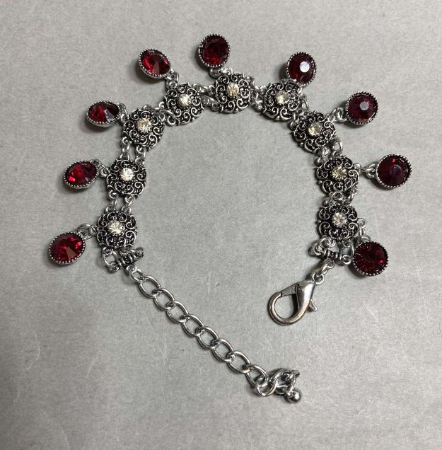браслет, кристали, червоний, срібло, жіночий аксесуар, подарунок, елегантний стиль, вишуканість, святковий образ, мода, біжутерія, прикраса, регульований, підвіски, сяйво
