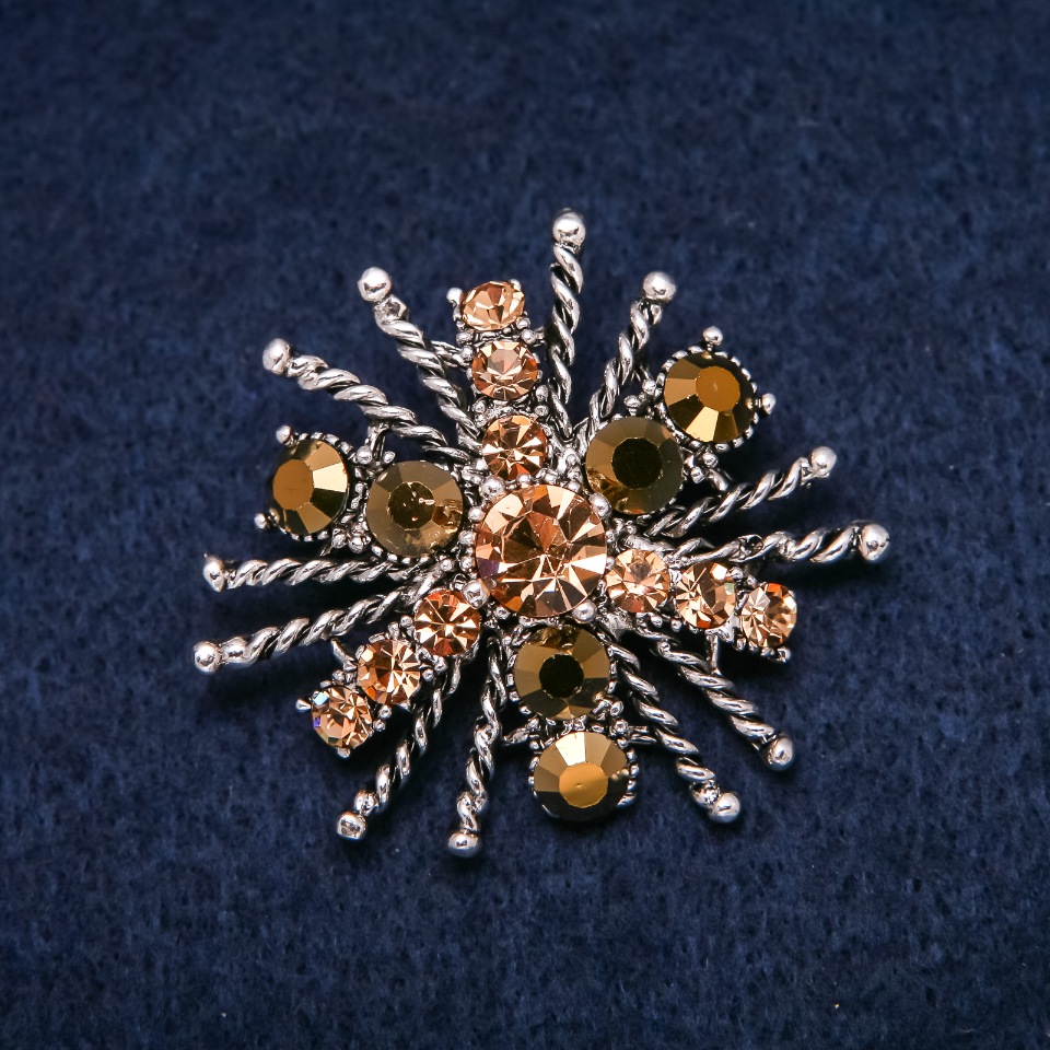 брошка, жіноча прикраса, аксесуар, сріблястий метал, стрази, жовтий колір, елегантний стиль, вечірній образ, подарунок, фурнітура, модний акцент