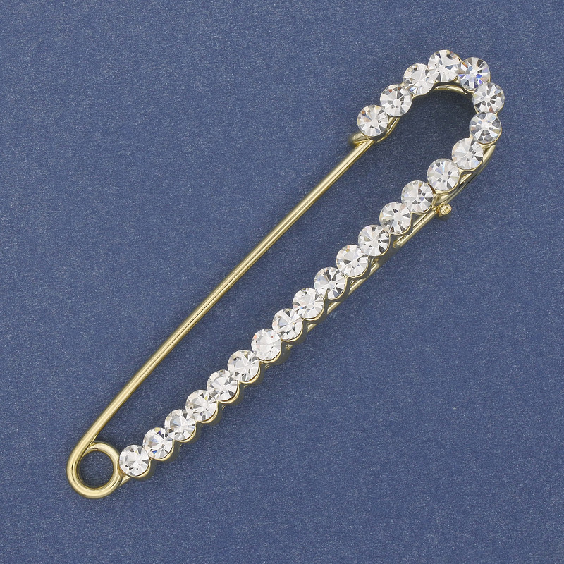 Брошка шпилька з білими стразами 75х16мм+- золотистий метал