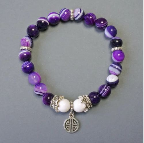 Фіолетові відтінки агату асоціюються з глибиною, загадковістю та творчим натхненням, тоді як білий камінь додає легкості, чистоти та гармонії. Разом вони створюють візуальний баланс, який чудово підходить як до класичних, так і до сучасних образів. Такий браслет легко поєднується з іншими прикрасами — срібними, сталевими або навіть з натуральними матеріалами, підкреслюючи індивідуальність власниці.