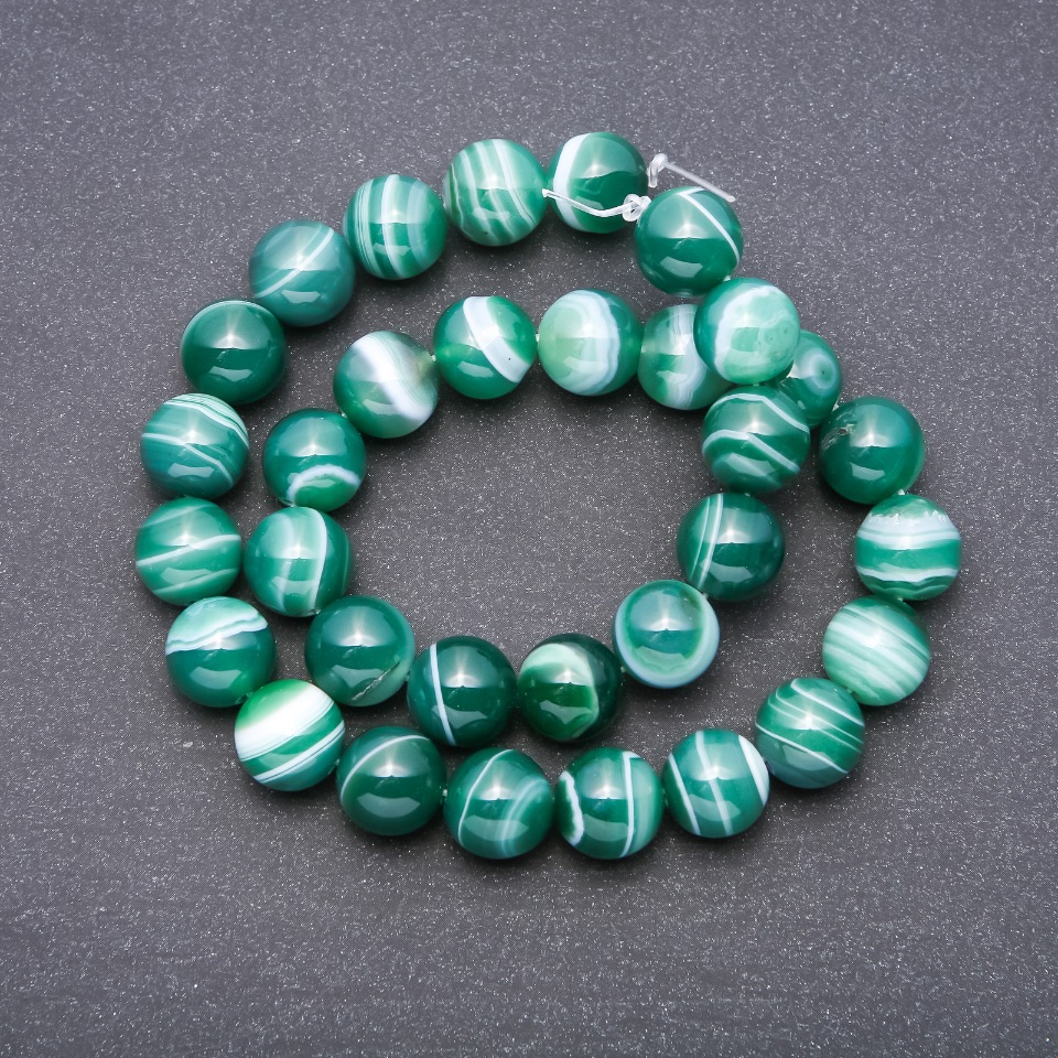 Зелені намистини з глазкового агату — це природна гармонія кольору та текстури, що поєднує в собі витонченість і глибину. Кожна кулька діаметром 12 мм має унікальний малюнок, створений самою природою: ніжні переливи зелених відтінків, що нагадують структуру м’яких хвиль або розмитий візерунок листя під сонячним промінням. Цей камінь завжди виглядає благородно, додаючи прикрасам природного шарму та індивідуальності.