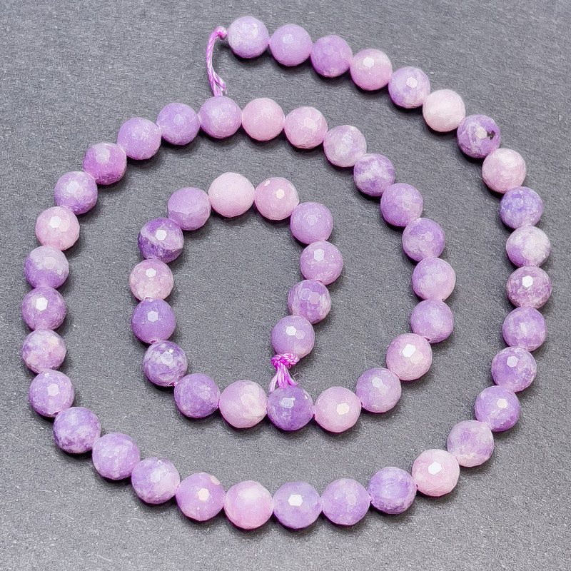 Намистини з лепідоліту — це втілення ніжності та природної гармонії, що надихає створювати прикраси з глибоким змістом і витонченою естетикою. Грановані кульки діаметром близько 6 мм нанизані на нитку довжиною 36 см, утворюючи елегантну палітру м’яких лавандових і сіро-фіолетових відтінків, які змінюються під різним освітленням, надаючи виробам особливої гри світла.