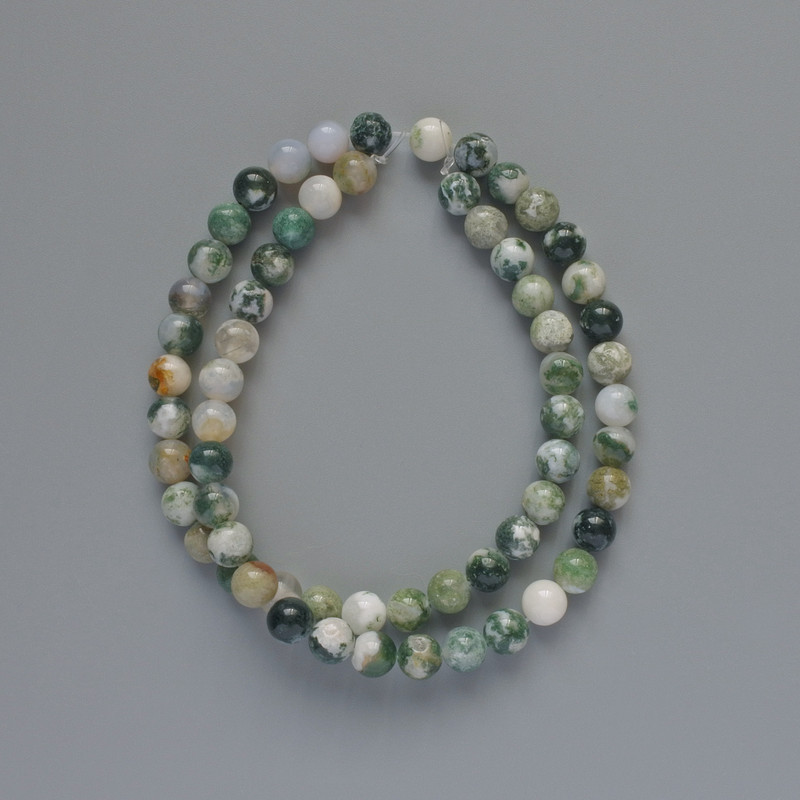 Моховий агат — це камінь, у якому природа залишила свій відбиток. Його напівпрозора структура, пронизана тонкими вкрапленнями, що нагадують мох чи лісові гілочки, створює відчуття гармонії та спокою. Намистини з цього каменю виглядають як мініатюрні пейзажі, у яких поєднуються відтінки зеленого, білого, сірого та іноді ніжного коричневого. Кожна кулька унікальна, немов створена самою природою, що додає прикрасам індивідуальності.