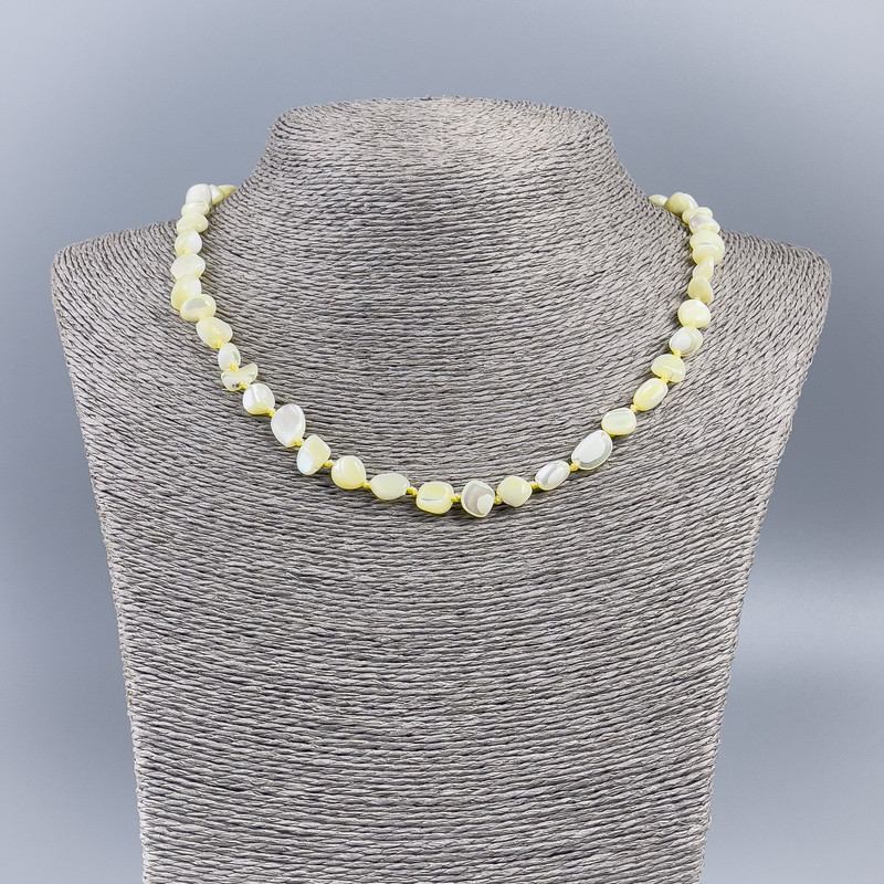 Довжина намиста близько 50 см дозволяє йому гарно лягати на шию, підкреслюючи лінію ключиць і додаючи образу жіночності. Світло-жовтий відтінок гармонійно поєднується як із теплими, так і з холодними кольорами одягу, тому прикраса легко впишеться у будь-який стиль — від повсякденного до урочистого. Перламутр має природну текстуру, що створює ефект глибини та руху, роблячи кожну намистину унікальною.