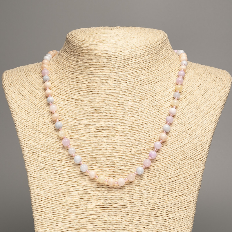 Намисто «Морганіт» — це витончена прикраса, яка поєднує у собі ніжність кольору та гармонію форми. Гладкі кульки діаметром близько 6 мм створюють рівномірну, плавну лінію, що м’яко лягає на шию, додаючи образу витонченості та легкості. Білий нефрит, з якого виготовлено намистини, має синтетичне походження та делікатне фарбування, завдяки чому камінь набуває м’якого відтінку, схожого на природний морганіт — символ чистоти та спокою.