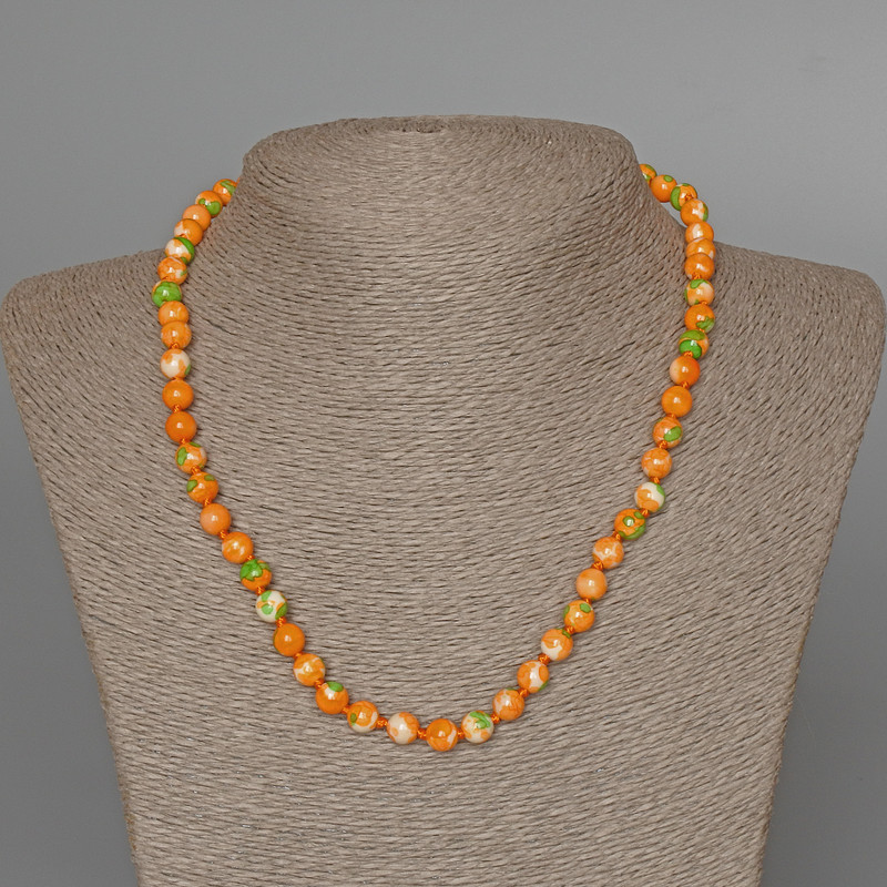 Намисто «Варисцит» — це гармонійне поєднання кольорів і форм, яке створює відчуття природної краси та витонченої елегантності. Його м’які зелені, помаранчеві та білі відтінки нагадують про теплі літні дні, легкість природи та спокій, який вона дарує. Гладкі кульки діаметром близько 7 мм утворюють рівномірний ритм, що приємно лягає на шию та підкреслює лінію декольте.