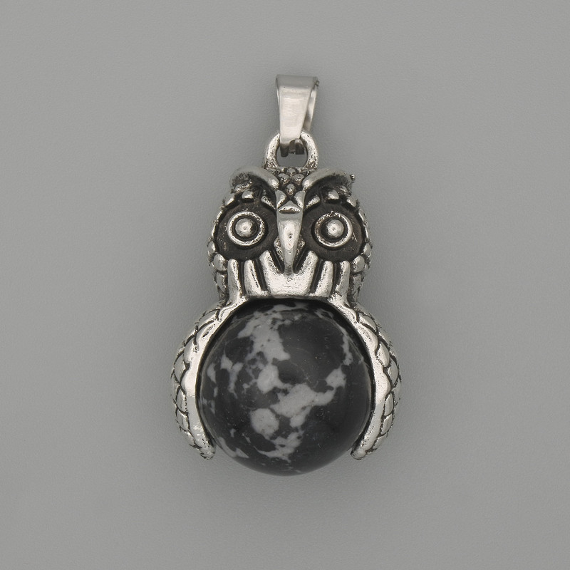 Кулон Сова Сніжний Обсидіан сріблястий метал, діаметр 30х20мм+-, довжина 37мм+