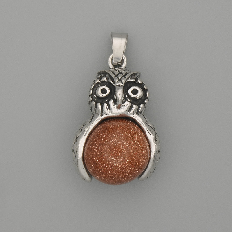 Кулон Сова Авантюрин золотий пісок сріблястий метал, діаметр 30х20мм+-, довжина 37мм+