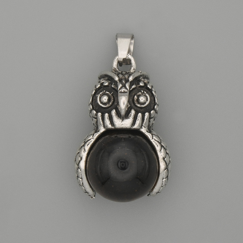 Кулон Сова чорний Агат сріблястий метал, діаметр 30х20мм+-, довжина 37мм+