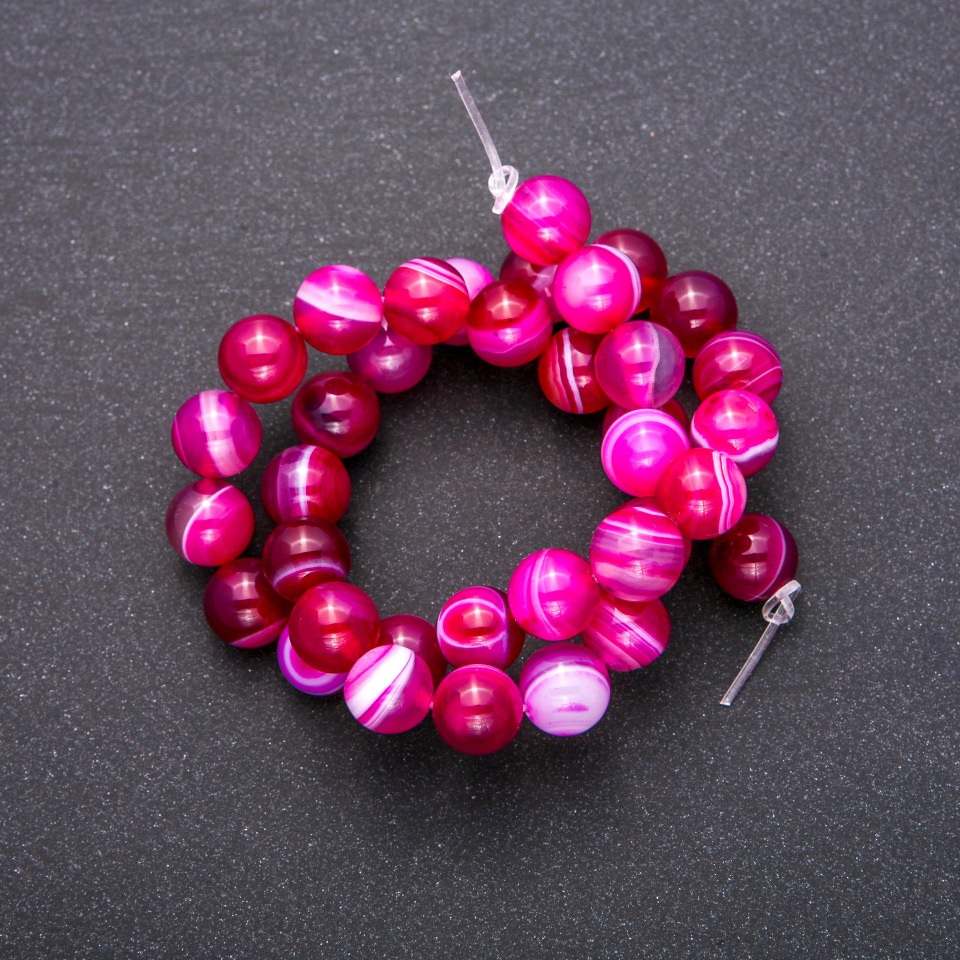 Малиновий агат вражає глибиною кольору — від насичених рожево-червоних до ніжних світлих відтінків, які плавно переходять один в один. Ця природна гра кольорів створює ефект живої текстури, завдяки чому кожна намистина має свій унікальний малюнок. Гладка поверхня приємна на дотик і надає виробу відчуття довершеності.