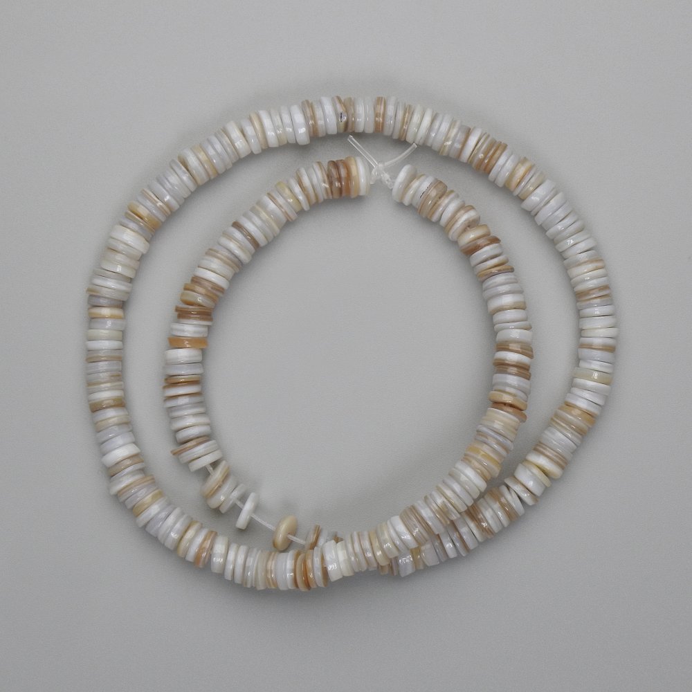 Діаметр намистин становить приблизно 6 мм, товщина — близько 1–1,5 мм, що робить їх ідеальними для створення легких, але виразних аксесуарів. Вони нанизані на волосінь довжиною близько 39 см, що зручно для подальшого використання — чи то для браслетів, кольє, сережок або декоративних елементів у комбінованих виробах. Завдяки природному походженню мушлі, кожна намистина має свій неповторний відтінок — від кремово-білого до ніжно-рожевого чи сірувато-перламутрового.