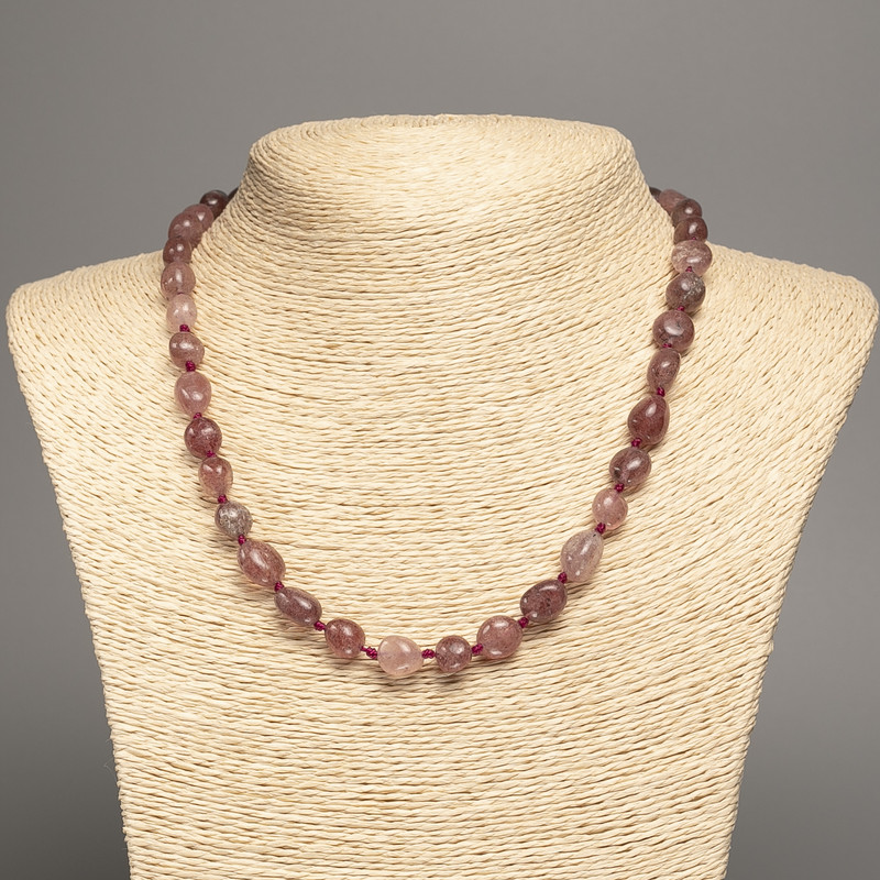 Полуничний кварц відомий своїм делікатним блиском і приємною текстурою. Завдяки ручному поліруванню кожна намистина зберігає природну форму, що додає прикрасі живого характеру. Довжина 46 см дозволяє носити намисто як самостійний акцент або поєднувати з іншими виробами з натурального каміння, створюючи багатошарові композиції.